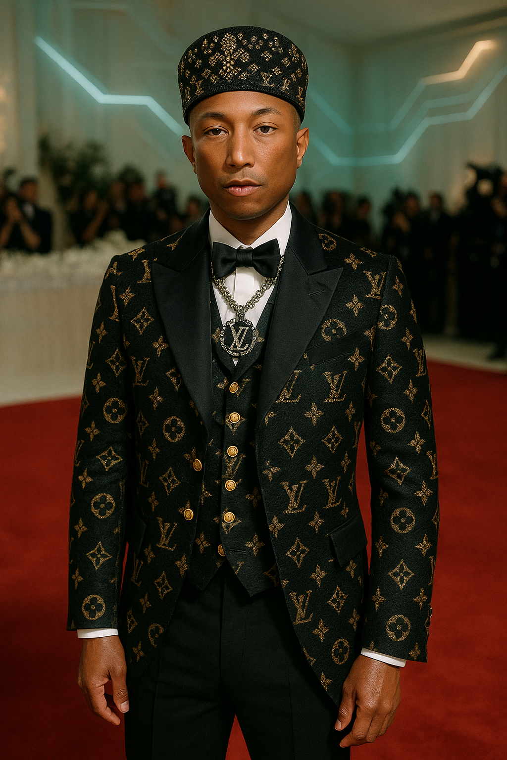 För musikgeniet och Louis Vuitton-bossen Pharell Williams kändes det självklart att be om att han skulle vara klädd i just Louise Vuitton. Jag tycker AI gjorde ett bra jobb med likhet med personen och en passande stil. ”Bell boy”-looken kanske inte är helt smickrande, och mönstret är kanske Dapper Dan, än Louis Vuitton men jag ger ändå bilden godkänt.