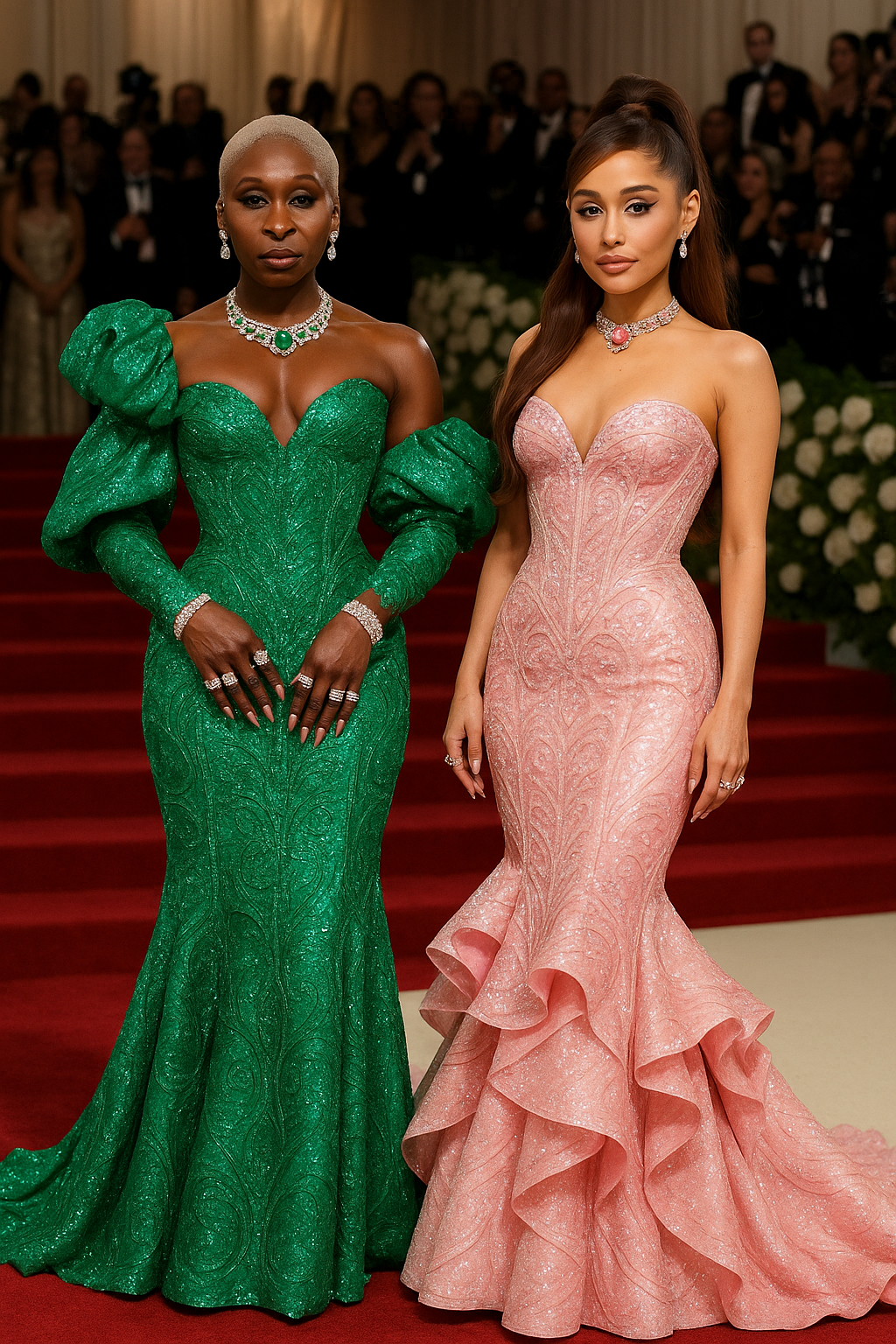 För Wicked-stjärnorna Cynthia Erivo och Ariana Grande som ju gått på varenda gala och premiär det senaste året i kläder inspirerade av sina rollfigurer i filmen – Cynthia i grönt och Ariana i rosa – bad jag om att de skulle vara klädda i sina signaturfärger i stil med modehuset Versace, men fortfarande på galans tema. Bilden blev ganska lik förlagorna men temat fångades inte riktigt upp, Ariana Grandes look är inaktuell, och det såg inte heller ut som Versace.
