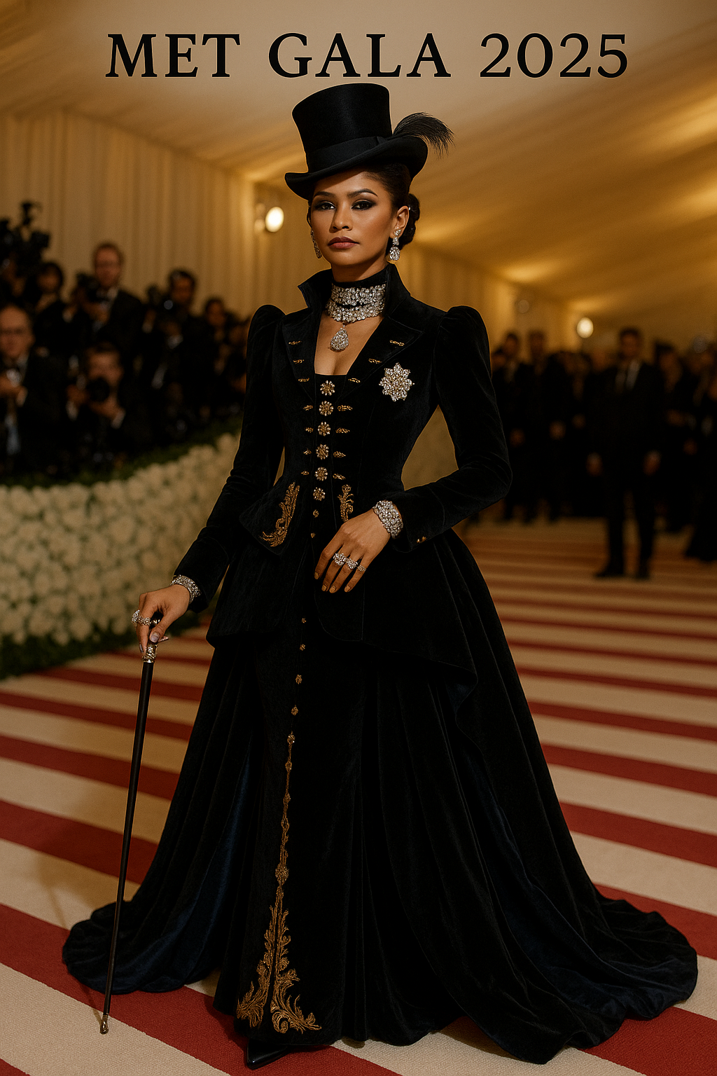 Min promptPlease create a photo realistic image of a person looking like the actress Zendaya attending the Met Gala 2025 with the theme "Black dandy—an archetype that can be traced in America to the 18th century—and explore the intersection of fashion and Black identities." Here you can read about an exhibition that will be opening after the gala https://www.metmuseum.org/exhibitions/superfine-tailoring-black-style. I want the model to be dressed in a long extravagant dress inspired by the theme with expensive and excessive jewelry and glamorous make up that goes suitable for the Met Gala. |