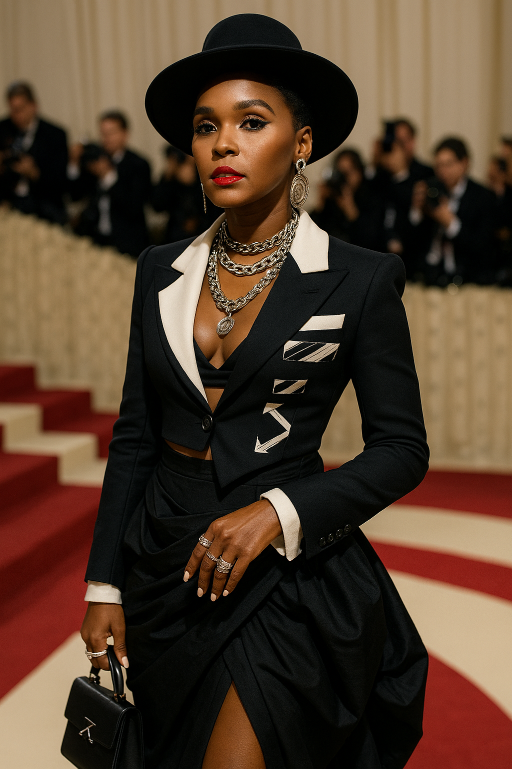 Bilden är inspirerad av skådisen och stilikonen Janelle Monáe’ i en outfit som ska se ut att vara skapad av Off-Whites llegendariska designer Virgil Abloh.